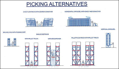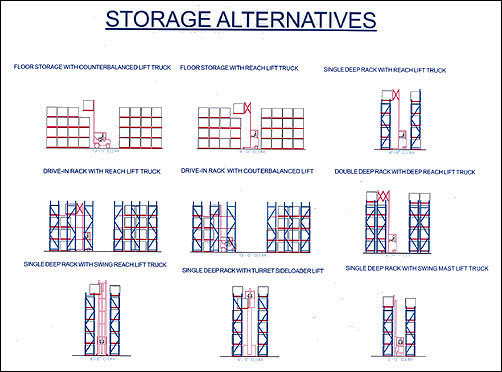 Approach alternative material handling methods to determine other building aspects, such as aisle widths, lighting design, need for mezzanine space, fire protection, and egress design. Businesses will often use different methods of storage handling simultaneously for different products.